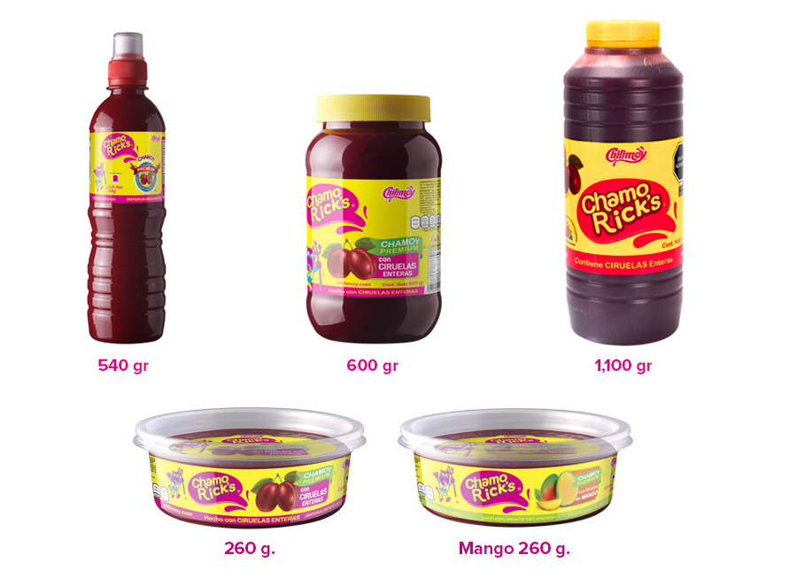 Actualmente contamos con siete líneas de productos: Chilimoy Original, Chilimoy Naranjita, Picosito, Chamorick´s, PikaChamoy, Chuper Chamoy y chile en polvo La Tambora.